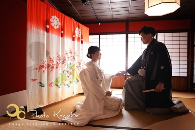 金沢ではご結婚の際、新婦のお母様が嫁入り道具として「花嫁のれん」を持たせるという風習があるんですが、その「花嫁のれん」を飾って写真撮影を行ったりすることもあります。こちらは金沢ならではのシチュエーションと言えるかもしれません(上記写真)。